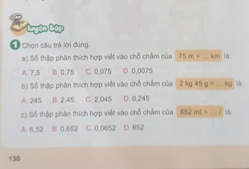 ✏️ Câu a: 75 m = … km